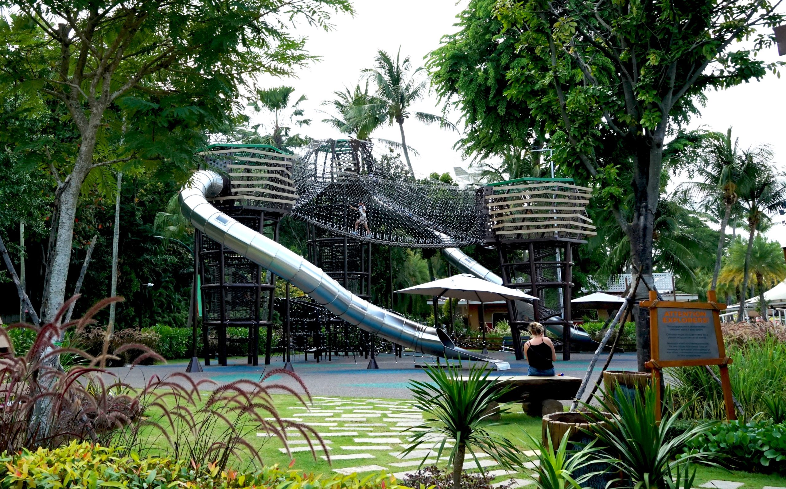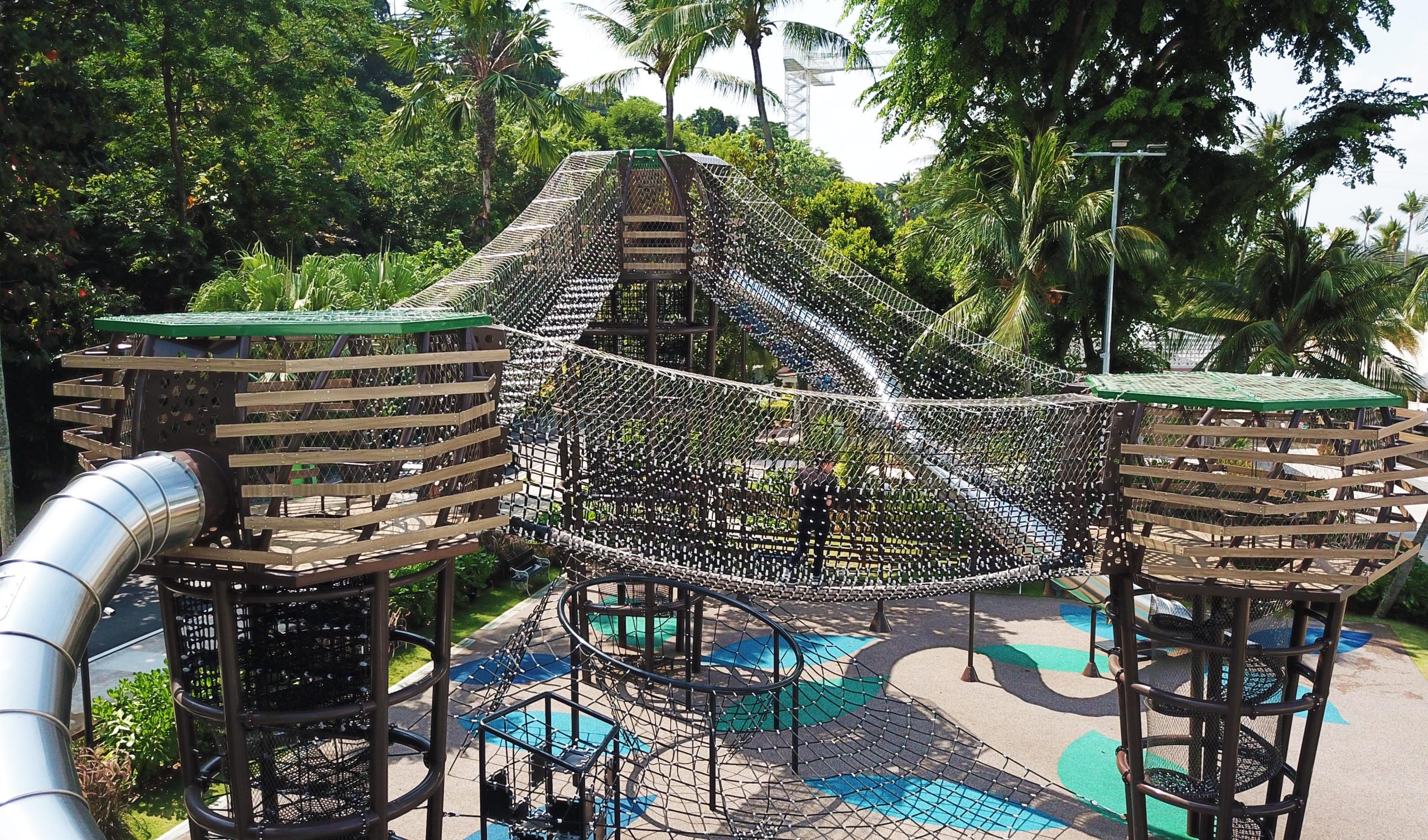 The multi-tiered towers are linked by suspended rope bridges and nets that challenge balance and coordination. Giant tube slides add thrilling descents, while lookout points offer a scenic reward for the climb.
